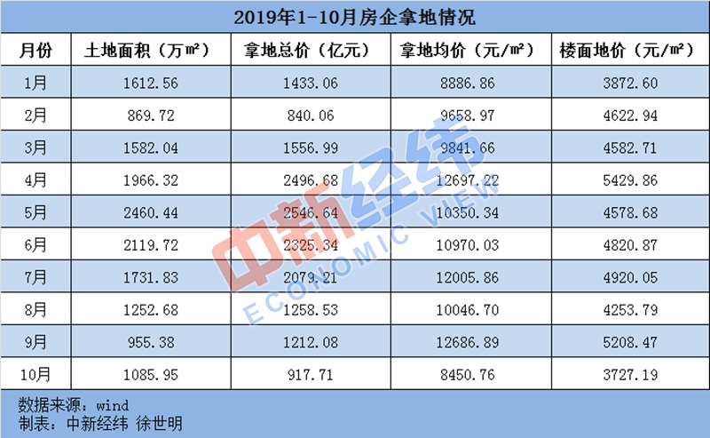中新经纬客户端11月20日电 (徐世明)数据显示,2019年10月房企拿地继续收缩,拿地总价已跌破千亿元,拿地均价降至年内最低。