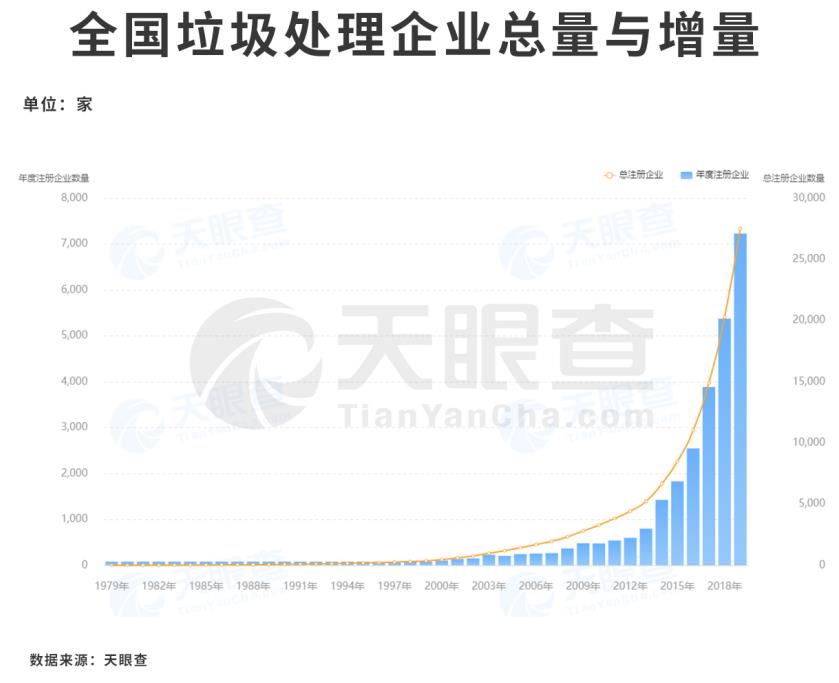 垃圾分类的大力推行,给垃圾处理相关企业带来了商机。天眼查数据显示,目前我国经营范围中含“垃圾处理”的在业、存续、迁出状态企业已超2.7万家。