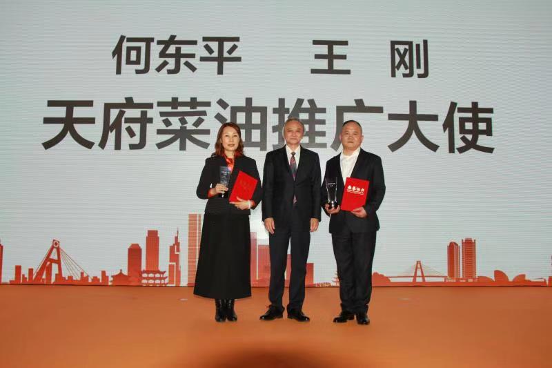 四川省粮食行业协会向何东平教授、王刚董事长授予了“天府菜油推广大使”荣誉称号