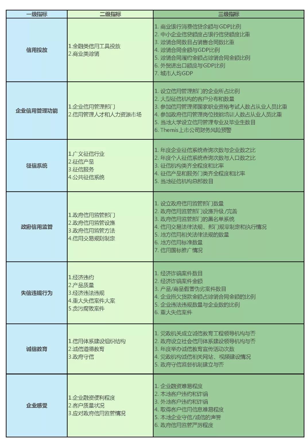 CEI指数围绕信用投放、企业信用管理、征信系统、政府信用监管、失信违规行为、诚信教育、企业感受等7个一级指标、23个二级指标、42个三级指标,对城市的信用环境进行综合评价。