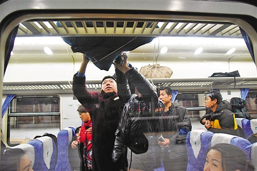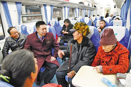 包头至广州K598/7列车上,刘宇锋(左二)在了解乘客需求。该趟列车全程3000多公里,每一次值守他需要在列车上至少待8天。