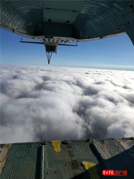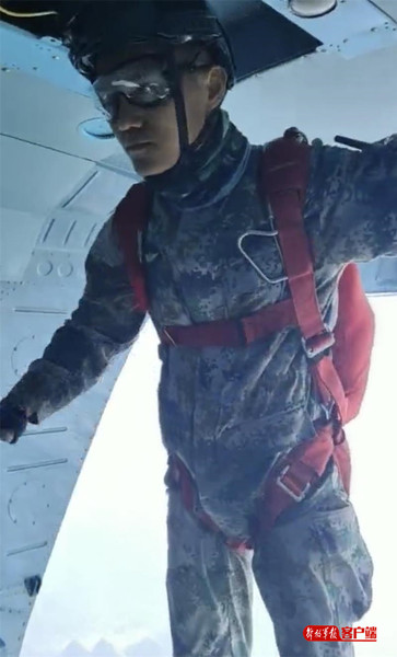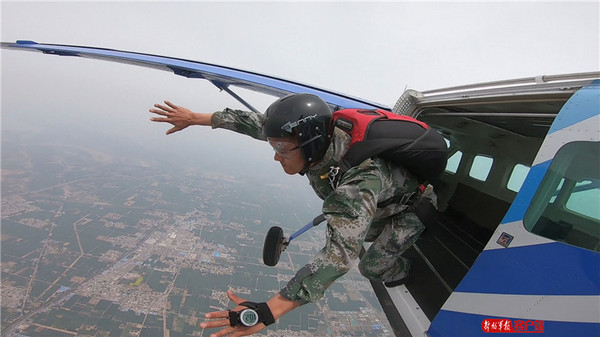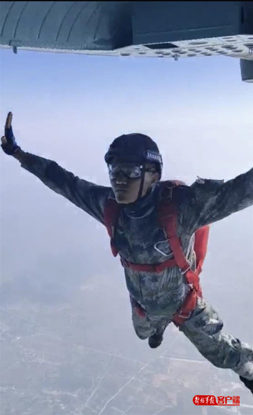 3000米的高空,作为示范首跳,张鹏德一个漂亮的转体,跃出舱门。