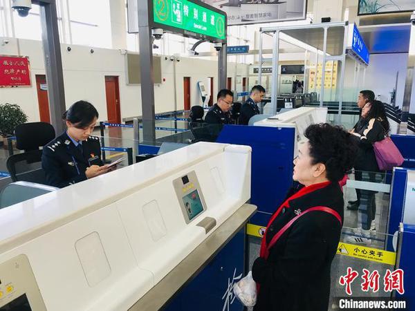 图为兰州边检站民警核对人员及证件信息无误后,盖章放行。艾庆龙 摄