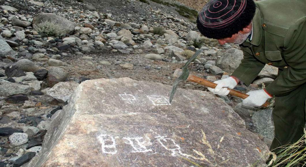 见我盯着这张照片,巴依卡伸出手掌向我比划着这块大石头所在的地理位置:边境线上,几国交界处,本有一个木头的国界标志,但是久经风吹日晒,字迹模糊不清。于是,就有了照片上的一幕?!跋M泄礁鲎植唤鼋鍪窃谑飞嫌涝肚逦?。我还刻下了自己的名字,希望我们家以后的护边员可以看到?!卑鸵揽ê桶匚⑿ψ拧?/p>