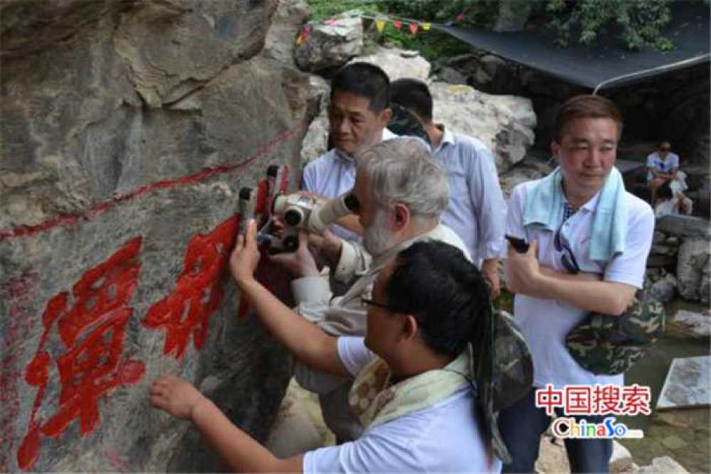 摩崖石刻的断代,研究会的年轻人和年届七旬的“老贝(Robert Bednarik)”双手紧紧按住电子仪器,因为观察的石英晶体太小了,轻微的移动就“跑”出来了界外;“老贝”沿着悬崖卷曲在洞窟中让人揪心;他为了找到合适的晶体长时间靠在岩石上的肘部磨出了一条条的血痕;大家身上都有不知名的虫子咬留下的“痒疙瘩”;而汤惠生老师的两只鞋底儿都分开了;大家的换洗衣服没有拿,上衣湿了又干干了又湿的汗渍一道道,裤子出汗粘结风干再出汗再粘结似乎硬的可以竖立起来,真的不好受,但大家都十分投入,都咬牙坚持了下来。和刘五一一起多年的河南省黄帝故里文化研究会的同事们对于他和“老贝”流利的语言交流一直很羡慕,这也是多次成功合作的良好基础。