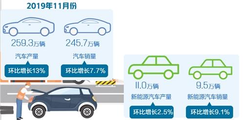 具体来看,2019年11月份,汽车产销分别为259.3万辆和245.7万辆,环比增长13%和7.7%,产量同比增长3.8%,销量同比下降3.6%,降幅较上月继续收窄。1月份至11月份,汽车产销2303.8万辆和2311万辆,同比下降9.0%和9.1%,产销降幅比1月份至10月份继续呈小幅收窄态势。