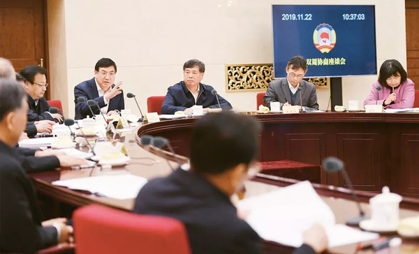 双周协商座谈会是政协民主协商的重要形式之一,是政协委员与中央和国家机关定期座谈交流党和国家重大关键课题的协商平台。图为2019年11月22日,全国政协举行“协同推进公益诉讼检察工作”双周协商座谈会。会上,委员、专家和相关部委负责同志就如何贯彻落实党的十九届四中全会精神,调动各方力量共同探索公益司法?;さ摹爸泄桨浮保箍攘姨致?。人民政协报 田福良/摄