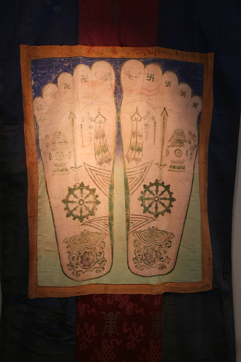 国际唐卡展区还展出了10幅文物级藏品唐卡,展示了精美绝伦的古代技艺。图为热贡艺术博物馆收藏的文物《清彩绘佛足图唐卡》