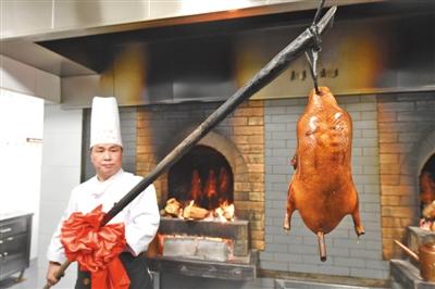 昨日,全聚德王府井烤鸭店,2020年第一只写有福字的烤鸭出炉。新京报记者 吴宁 摄