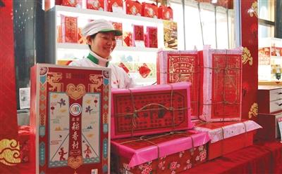 稻香村工作人员展示礼品套盒“京八件”、“细八件”。新京报记者 陈琳 摄
