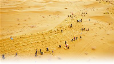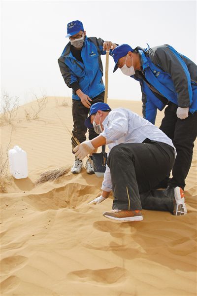 贾其煜的林场,已经向巴丹吉林沙漠腹地挺进了14公里。车行其间,只见梭梭、骆驼刺、花棒等沙生植物迎风轻舞,顽强生长,“梭梭树固沙作用很明显。你看,每棵树周边的沙地都已经比较稳固,沙子上边有了土壤结块”。