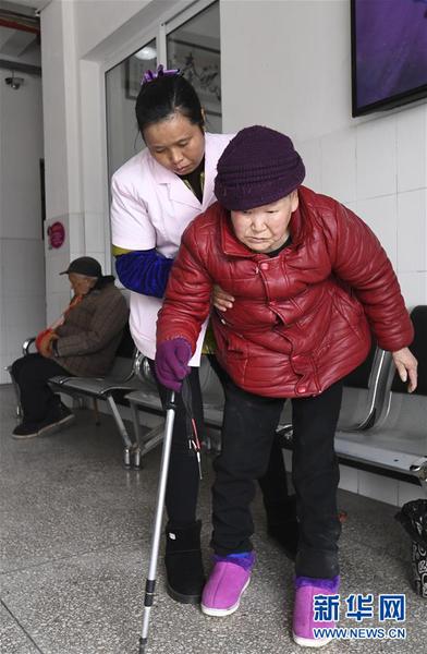2019年12月27日,重庆奉节县草堂镇失能供养中心的工作人员扶着失能人员行走。新华社记者王全超摄