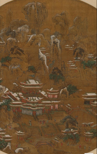 唐朝诗人杜牧有一首诗《长安雪后》描写了当时长安的雪景:“秦陵汉苑参差雪,北阙南山次第春。车马满城原上去,岂知惆怅有闲人。”唐代画家李思训的《京畿瑞雪图纨扇》则更加直观、形象地描绘了长安的瑰丽雪景。纨扇,又称团扇、宫扇,因形似圆月,且在宫中多用而得名。即这幅画是画在纨扇上的。在唐朝,将长安城周边地区分为京县(赤县)和畿县,京城所管辖的县为赤县,京城的旁邑为畿县,统称京畿。这幅画所绘的地区是长安城及周边地区。