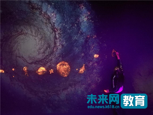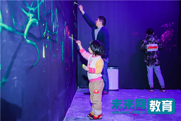 记者注意到,现场设置了五个儿童艺术工作坊。以“宇宙大爆炸”工作坊为起点,很多小朋友使用荧光颜料在黑色墙面上进行涂鸦,模拟宇宙大爆炸中生命随机产生的过程。