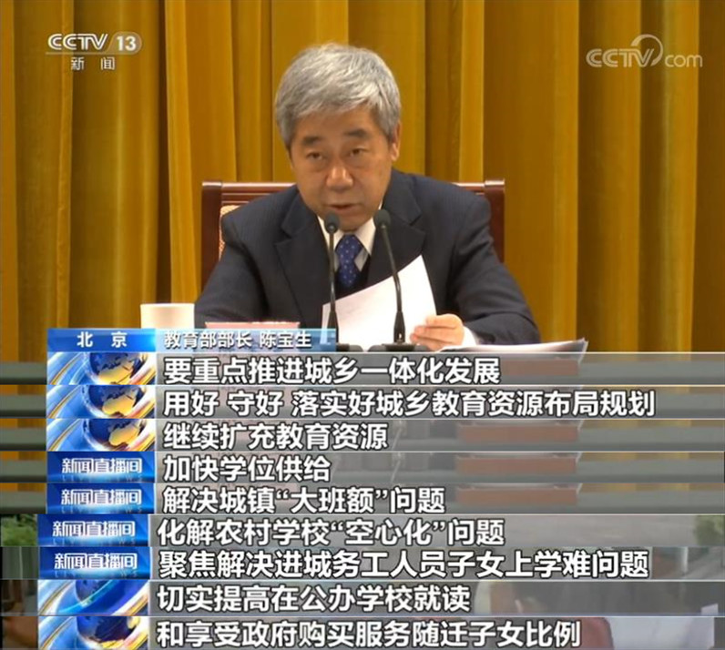 教育部部长陈宝生表示,深化,主要是义务教育均衡发展。要重点推进城乡一体化发展,用好、守好、落实好城乡教育资源布局规划,继续扩充教育资源,加快学位供给,解决城镇“大班额”问题,化解农村学?!翱招幕蔽侍?。聚焦解决进城务工人员子女上学难问题,切实提高在公办学校就读和享受政府购买服务随迁子女比例。