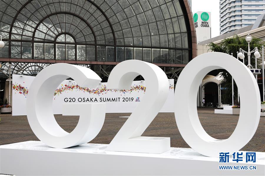 这是2019年6月27日在日本大阪拍摄的G20大阪峰会新闻中心入口处的标志。 新华社记者 杜潇逸 摄