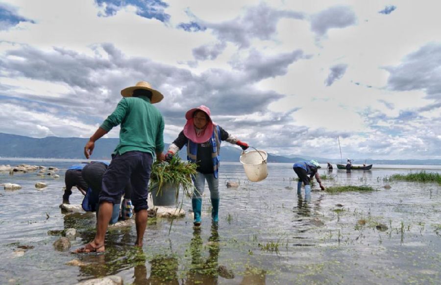 大理市湾桥镇古生村村民在打捞水草(2019年8月10日摄)。