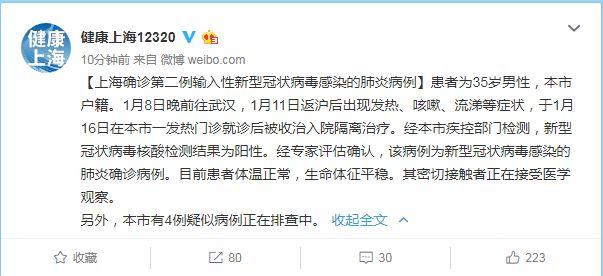 中新网1月21日电 据上海市卫生健康委员会官方微博消息,上海确诊第二例输入性新型冠状病毒感染的肺炎病例,患者为35岁男性,上海户籍。1月8日晚前往武汉,1月11日返沪后出现发热、咳嗽、流涕等症状,于1月16日在本市一发热门诊就诊后被收治入院隔离治疗。