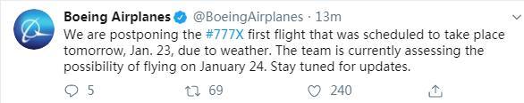 中新网1月23日电 据波音公司消息,波音777X飞机原定于当地时间23日进行首飞,但受天气原因影响,计划被推迟。目前,公司正在考虑将首飞定于24日的可能性。