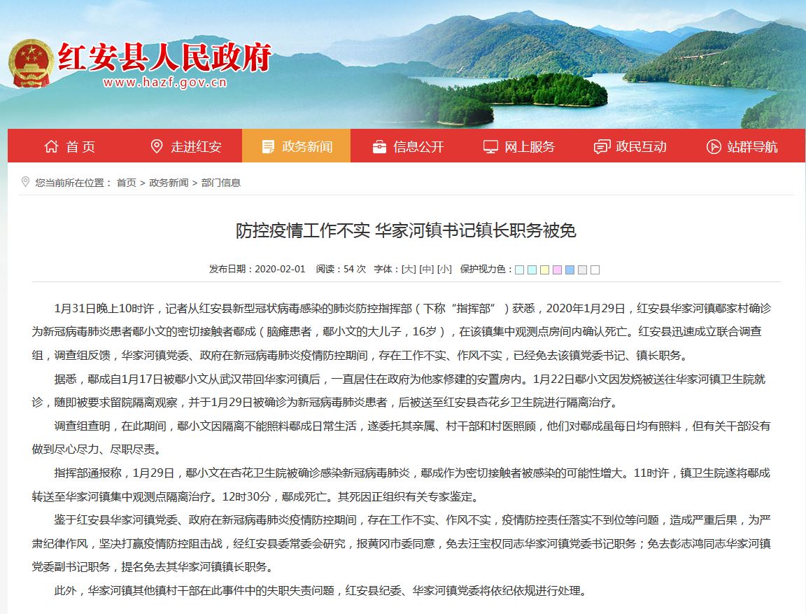中新网2月1日电 据黄冈市红安县政府网站消息,1月29日,红安县华家河镇鄢家村确诊为新冠病毒肺炎患者鄢小文的密切接触者鄢成(脑瘫患者,鄢小文的大儿子,16岁),在该镇集中观测点房间内确认死亡。红安县迅速成立联合调查组,调查组反馈,华家河镇党委、政府在新冠病毒肺炎疫情防控期间,存在工作不实、作风不实,已经免去该镇党委书记、镇长职务。