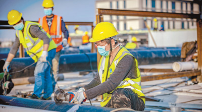 2 4日,雷神山医院建设现场,中建五局三公司工人正在抓紧施工。该院将于近日交付使用。