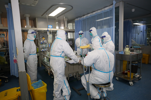 1月18日,饶歆和5位同事走进重症隔离病房,他们是武汉大学中南医院第二批走进重症隔离病房工作的医护人员。拄拐期间,大伙儿打趣,叫他“双拐医生”。有时候,饶歆还会跟他们一起拿自己开涮——谁还会在意呢,在只能通过笑声识别欢乐、肉眼不见笑脸的隔离病房?