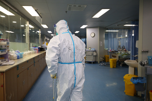 饶歆的防护服上写着名字和“加油!??!”。高翔供图