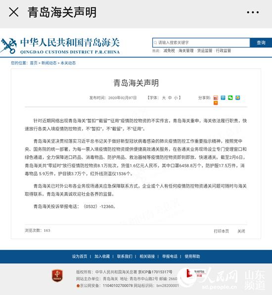 人民网济南2月7日电(宋翠)7日青岛海关官方网站发布消息表示,近期网络出现的关于青岛海关“暂扣”“截留”“征用”疫情防控物资的传言不实。