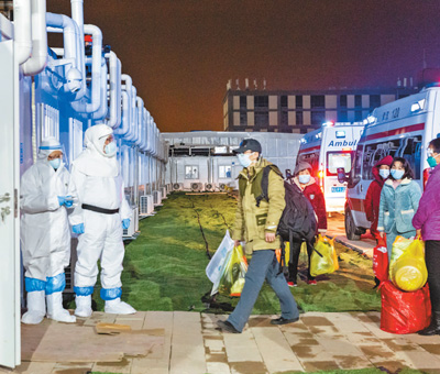 | 2月8日晚,第一批患者抵达雷神山医院。 本报记者 张武军摄 |