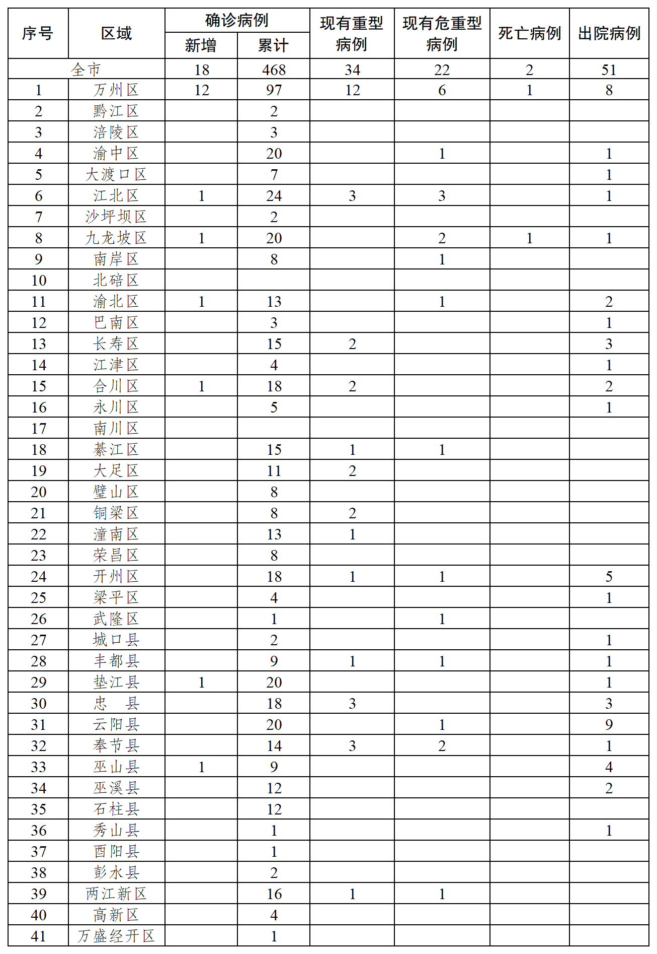 新增确诊病例中,万州区12例、江北区1例、九龙坡区1例、渝北区1例、合川区1例、垫江县1例、巫山县1例;新增重型病例中,万州区1例、江北区1例、长寿区1例、合川区1例、大足区2例;重型病例转危重型病例为万州区1例;新增危重型病例为渝中区1例;新增出院病例中,万州区3例、合川区1例、开州区3例、云阳县2例、巫溪县1例。