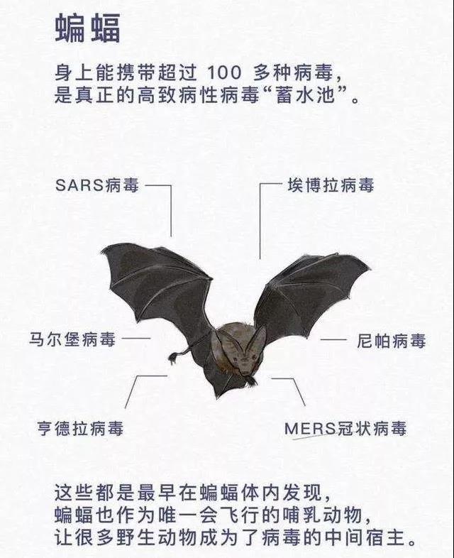 以蝙蝠为例,它是百余种病毒的自然宿主,可能携带埃博拉病毒、马尔堡病毒、狂犬病毒、亨德拉病毒、尼帕病毒等可能感染人类的病毒。由于蝙蝠具有特殊免疫系统,它虽携带病毒,自己却极少发病。