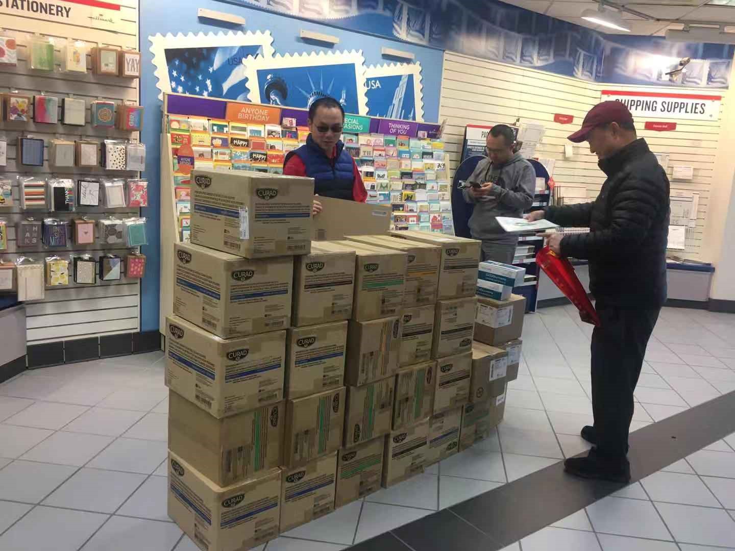 图说:盐湖城华助中心副主任彭伟、冷剑伟和理事占中华在当地邮局以国际快递形式邮寄物品