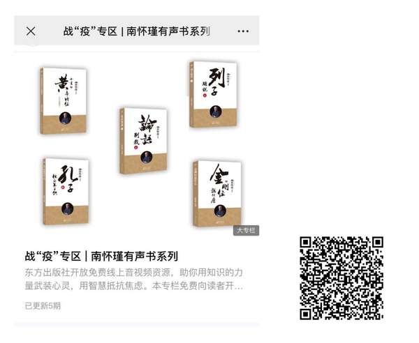 东方出版社携手旗下多个自媒体公号搭建战“疫”专题,用自己的方式给读者带来人文关怀。其中,“东方出版社”公众号搭建战“疫”专栏,从“实时动态”“疫情速报”“科普知识”“应对焦虑”等栏目,普及防疫的科学知识,链接权威机构提供线上医生咨询平台方便读者自我检测、发热寻医、在线解答、心理疏导。“南怀瑾东方讲堂”与“活法”公号则以丰富的内容给读者们以正能量,引导大众在危急时刻逆流而上。