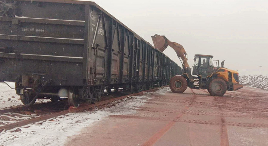 2月15日唐山货运中心汉沽网点为河钢集团发运到侯家庙的铁矿粉装车现场。拍摄 王子军