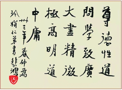 陈玲娟1944年毕业前夕,恩师徐悲鸿亲书寄语:“尊德性,道问学,致广大,尽精微,极高明,道中庸?!闭夥质樘逑至诵毂杳姥枷胗胍帐趵砟睿嗪侵醒朊涝盒Q怠熬【?,致广大”。