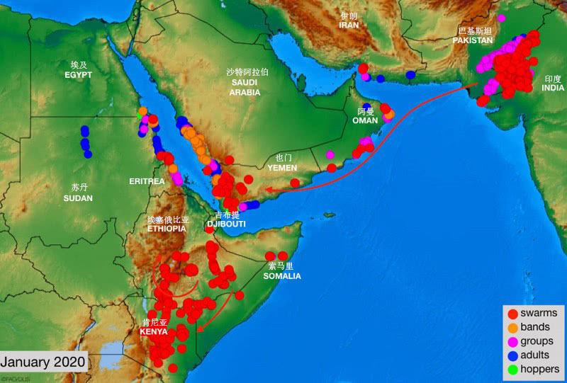 沙漠蝗自然分布于非洲從毛里塔尼亚到北非的撒哈拉沙漠,橫跨阿拉伯半岛、然后进入印度西北部,分布面积约1600万平方公里。沙漠蝗具有飞行能力强、食量大的特点,被认为是世界上最具破坏力的迁徙性害虫之一。迁飞时蝗群密度大,流动性强,其每天可以随风飞行 100~150 公里,每隔几年就会成灾暴发一次。由于气候和生活环境适宜,沙漠蝗繁殖量大,每年能发生2-5代,每头雌虫可产卵200-400粒,从幼虫发育到成虫只需要两三周,能够快速形成密度较大的种群,进而发展成迁飞型。目前暴发的沙漠蝗数量已超过 4000 亿头,波及到的国家包括东非的肯尼亚、埃塞俄比亚、索马里、苏丹、乌干达、坦桑尼亚,西亚的伊朗、也门、阿曼,南亚的印度、巴基斯坦等(图1)。自三月前从也门迁飞过来后,现已到达北非,飞越红海,进入中东和南亚,目前在巴基斯坦、印度肆虐危害。索马里、巴基斯坦等国为应对蝗虫灾害,宣布进入国家紧急状态。据报道,这次发生的沙漠蝗造成了肯尼亚约105万亩土地上的庄稼受害;造成印度555万亩农田受害,损失超一百亿卢比。
