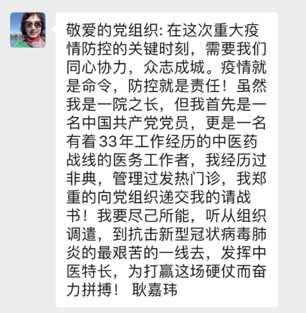“我请战,疫情就是命令,防控就是责任!我郑重向党组织递交请战书!尽己所能,听从组织调遣,到抗击新冠肺炎最艰苦的一线去,发挥中医特长,为打赢这场硬仗而奋力拼搏!”区政协委员、北京市鼓楼中医医院院长耿嘉玮不畏艰难、勇赴前线的声音铿锵有力。