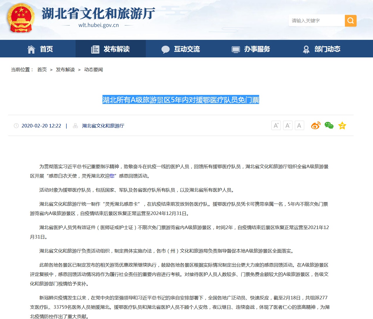 中新网客户端2月20日电(李金磊)湖北省文化和旅游厅20日表示,湖北省文化和旅游厅统一制作“灵秀湖北感恩卡”,在抗疫结束前发放到各医疗队。援鄂医疗队员凭卡可携带亲属一名,5年内不限次免门票游览省内A级旅游景区,自疫情结束后景区恢复正常运营至2024年12月31日。湖北省医护人员凭有效证件(医师证或护士证)不限次免门票游览省内A级旅游景区,时间2年,自疫情结束后景区恢复正常运营至2021年12月31日。