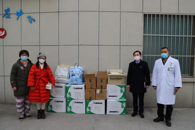 图为于小娟(左二)李静(左一)向盐城市第三人民医院捐赠购买的医疗防护物资。
