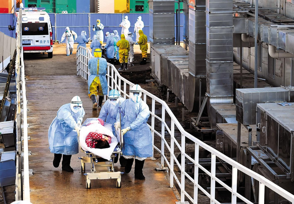 刚开始接收危重症患者时,医院被分为接诊区和指挥区两个区域,作为院长的张思兵在病人接收一线指挥,在ICU门口盯着现场。每一辆救护车来了都是先进行消杀,救护车从病房出去之前也要进行消杀。对于每个病人,医护人员都到车前一一去核对、交接,判断病人的病情,如果是重症就立即拉到病房抢救。
