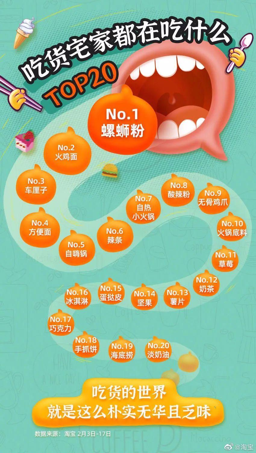 吃货宅家都在吃什么?1月24日至2月2日,京东平台的方便食品成交金额增长3.5倍,苏宁的自嗨锅品类销量同比大增370.27%。2月3日至17日,淘宝上,螺蛳粉、火鸡面、方便面、自嗨锅、自热小火锅、酸辣粉等速食食品进入热销榜单前十。