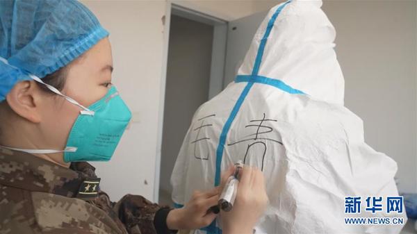 准备进入病房的毛青请同事在防护服上写下自己的名字(2月5日摄)。 新华社发
