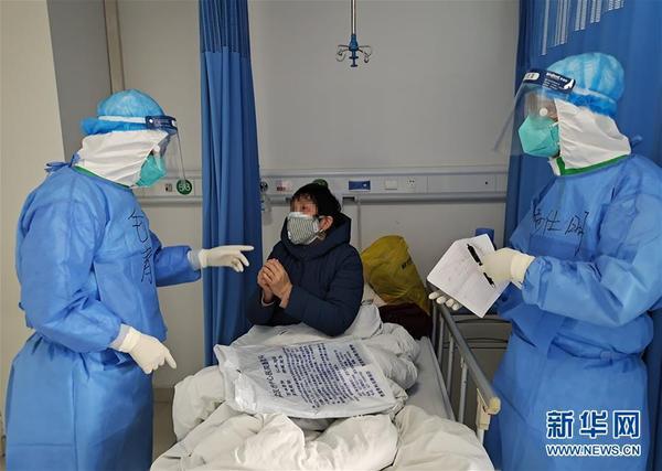 解放军感染病防控专家毛青(左)进入金银潭医院红区病房查房(1月31日摄)。 新华社发(高涛 摄)