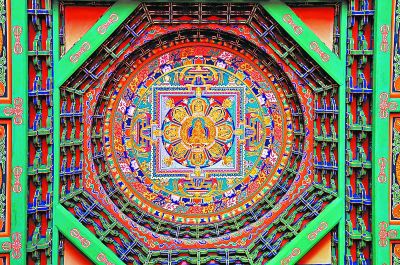 “蜜蜂飞到彩画上——空欢喜”,这句民谚形容的是彩画逼真,连小蜜蜂都难以区分真假。中国传统建筑常常使用彩画,而室内天花上的彩画,色彩斑斓,形式多样,是传统建筑美学的重要组成部分。