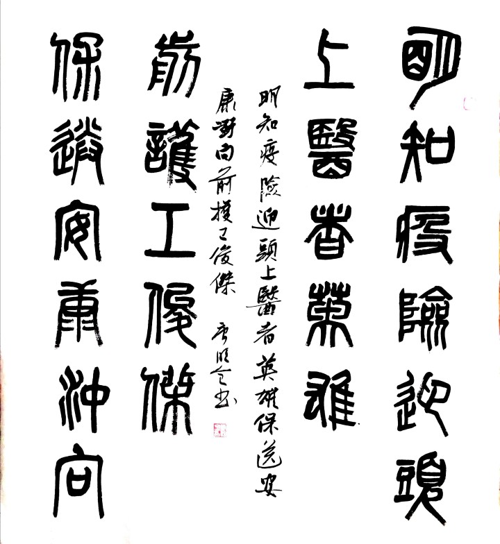 释文:明知疫险迎头上,医者英雄 保送安康冲向前,护工俊杰。