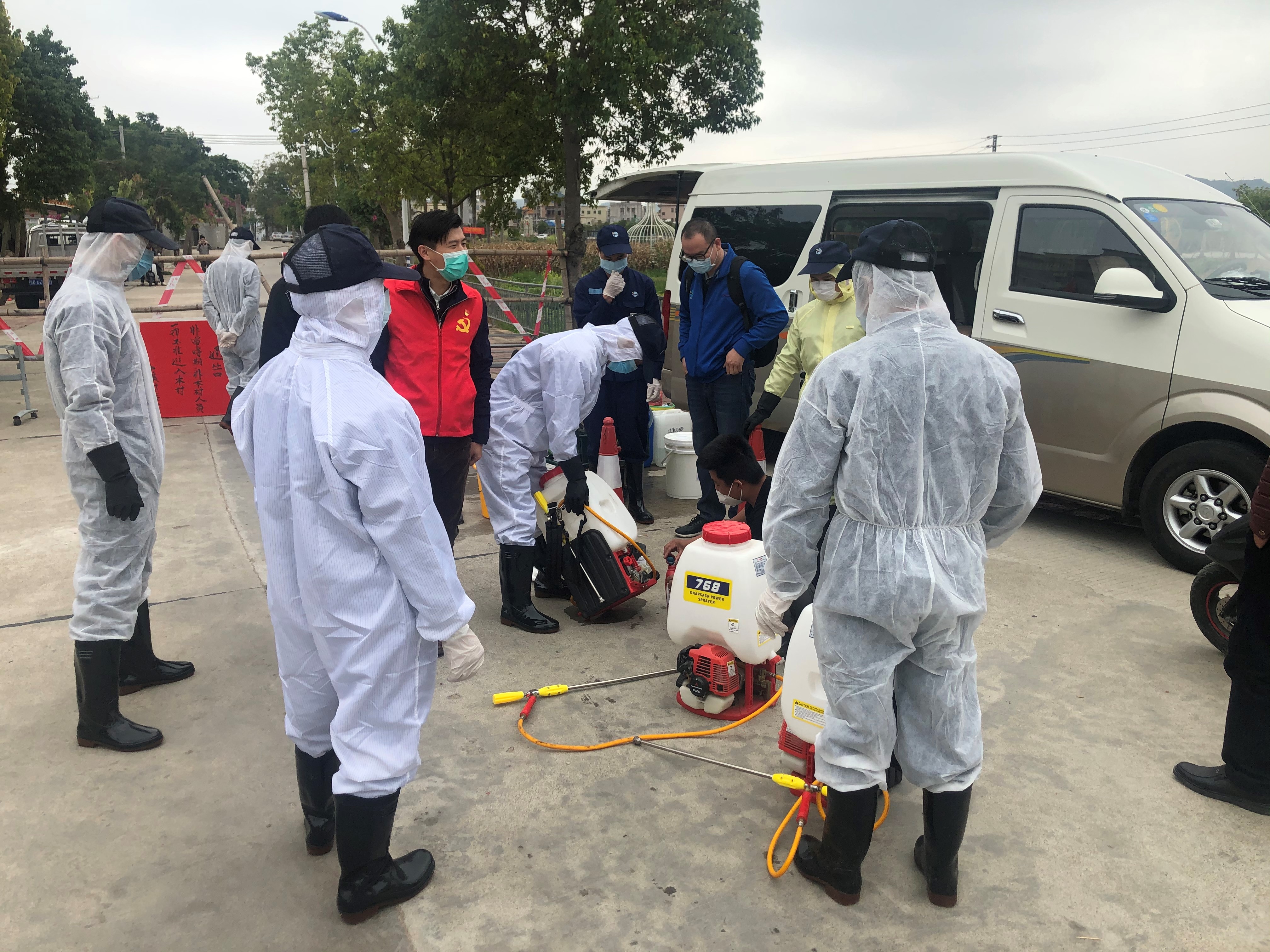 图为:驻村工作队队长周琨在安排专业公司对南溪村进行消毒灭菌