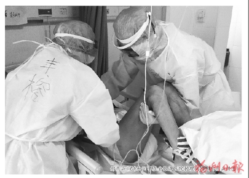 郑燕云(右)和同事在金银潭医院护理病人。(郑燕云供图)