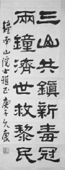 三山共镇新毒冠,两钟济世救黎民。 郑久康 书