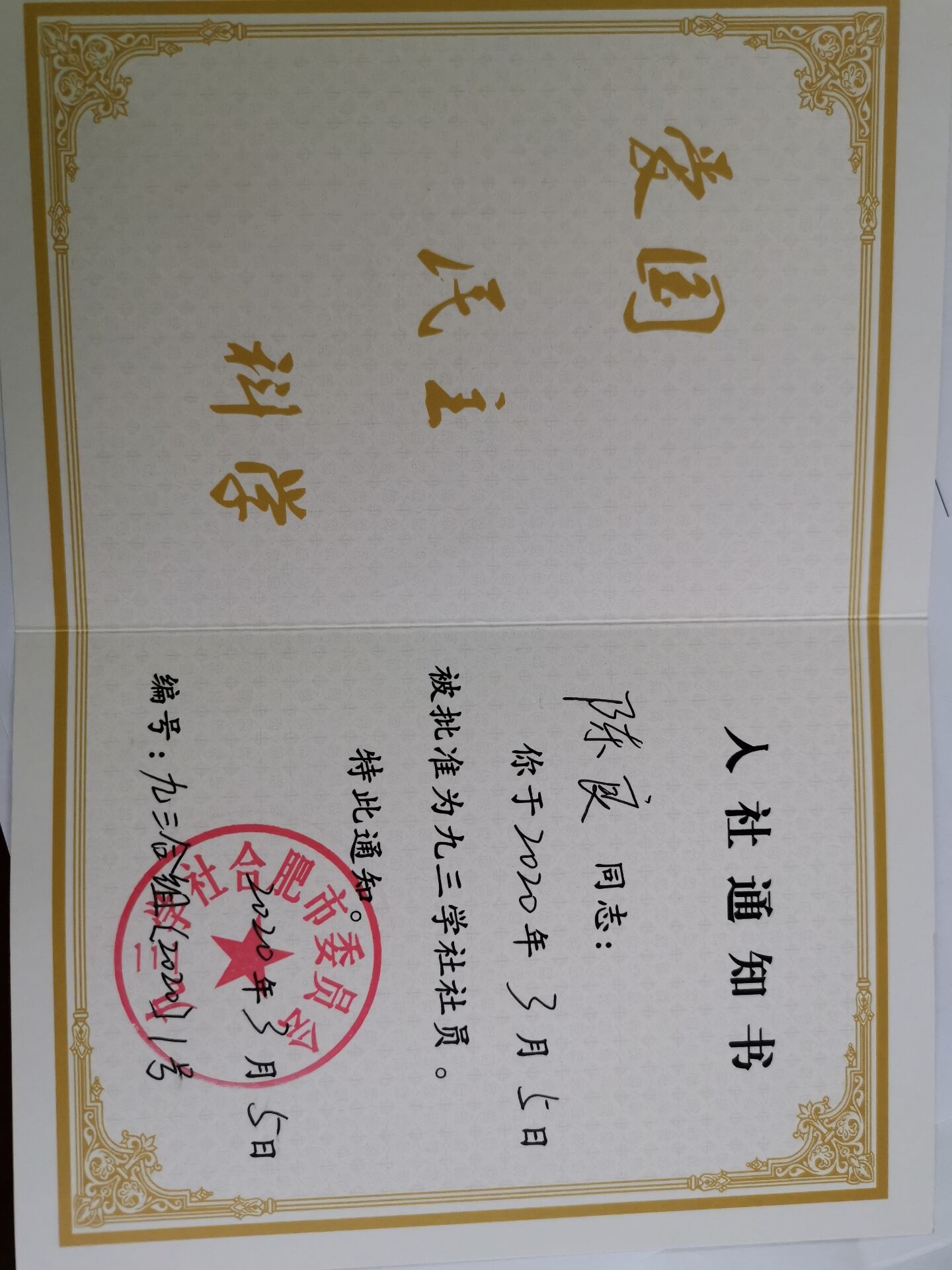 在入社申请书中,他写道:“九三学社前辈们对科技刻苦钻研、永不放弃的精神,对事业的无限忠诚、无私奉献的崇高品格令人感动。从他们身上所折射出来的知识分子的人格魅力,时刻在感召着我,激励着我去做一个道德高尚、学识渊博、技能精湛的人”。