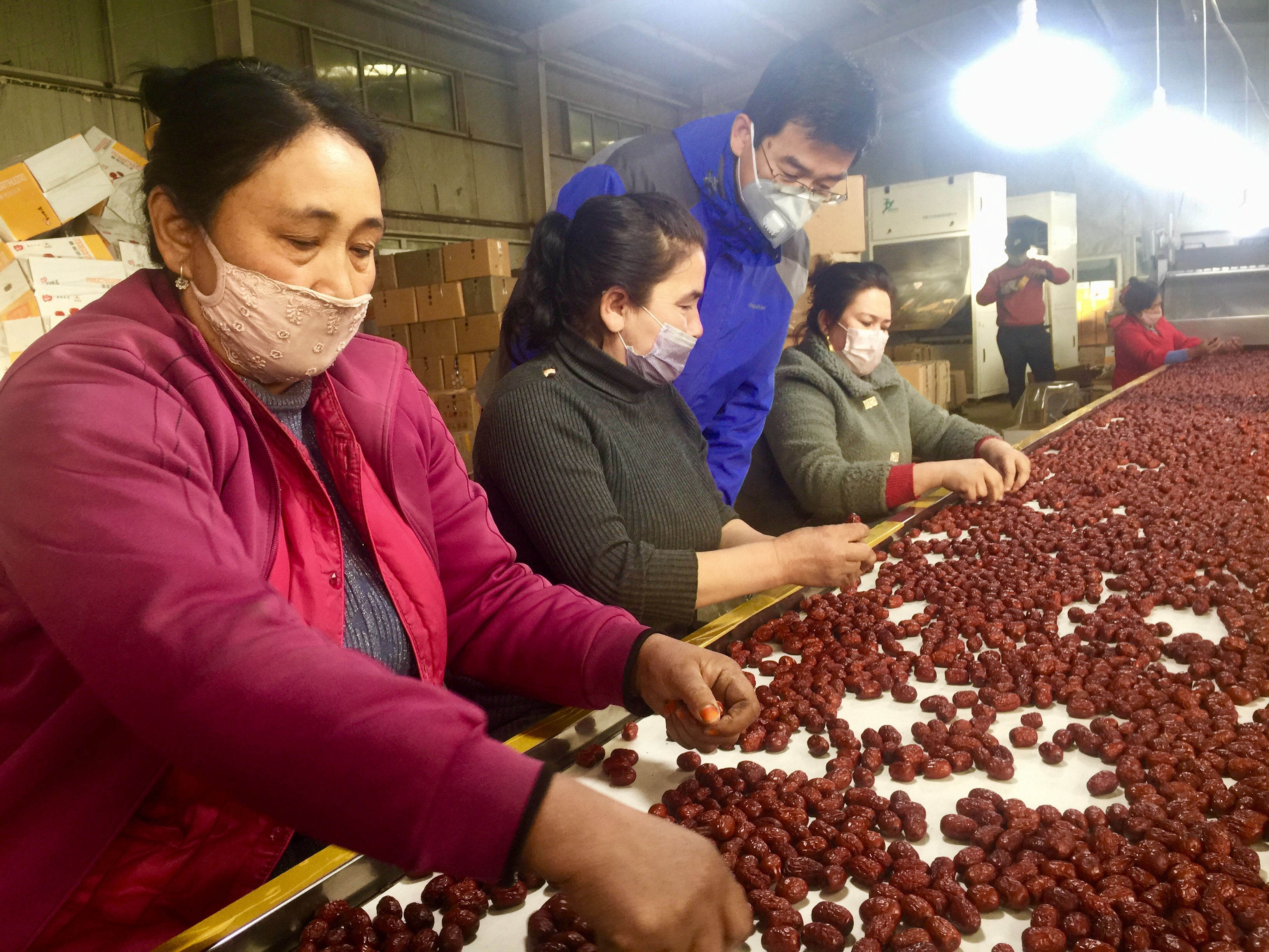 村民在巴楚县长远农业科技有限公司红枣车间筛选红枣
